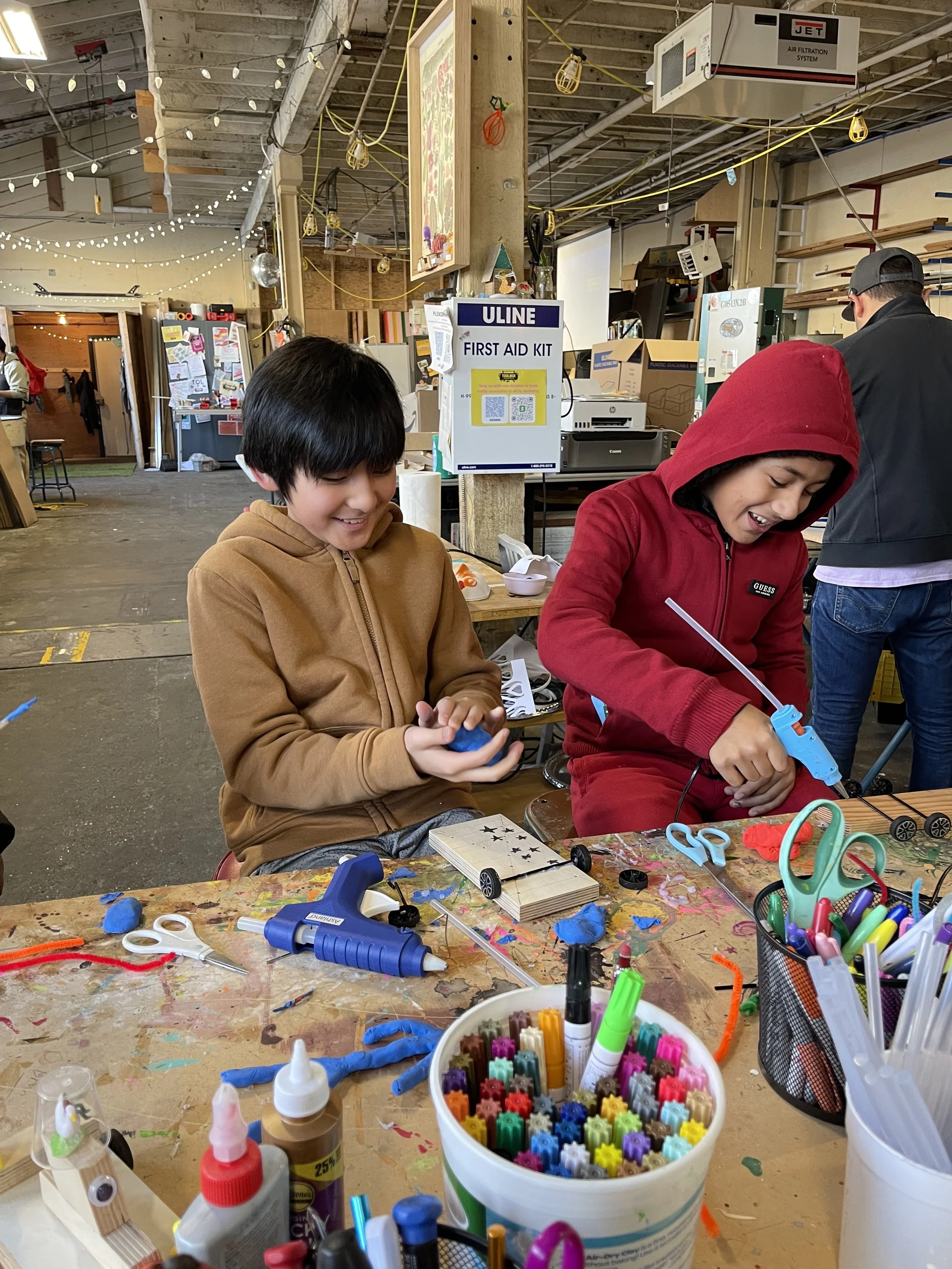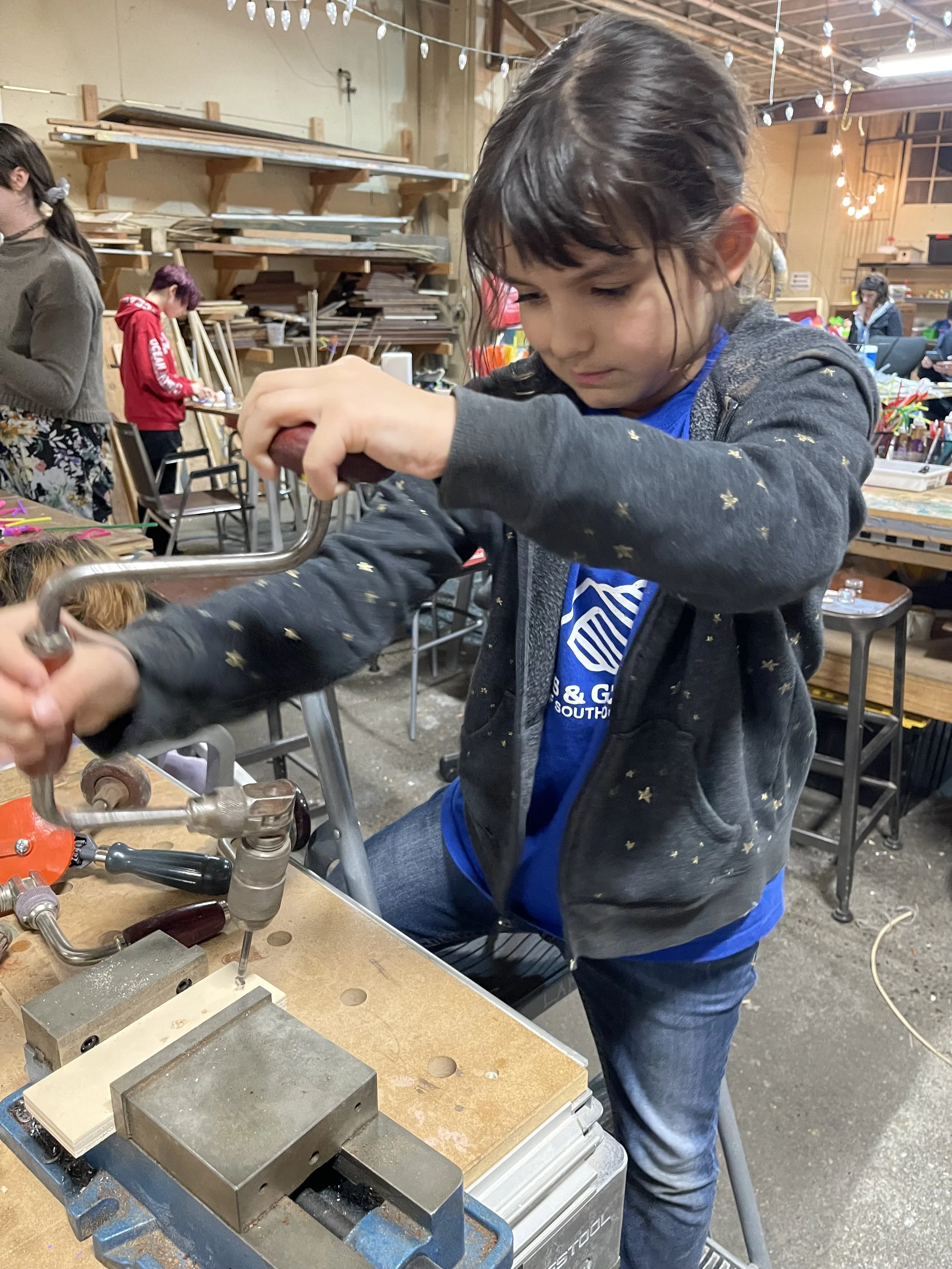 CRAFT NIGHT! community learned to use drill presses and hand held drills to create wooden creatures of all shapes and sizes.